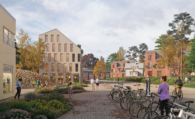 At the heart of the new vision is a car-free central square designed to foster casual interactions between visitors and residents. This square ties together commercial, cultural and recreational networks, creating a lively pedestrian-oriented urban node. New buildings help reinforce these axes, with architecture that complement rather than disrupt the existing urban fabric. Material choices for the new construction play a crucial role in minimizing environmental impact and aligning with the existing character. Sustainable facade materials, such as stone, red brick and wood help connect new construction to the existing building stock.